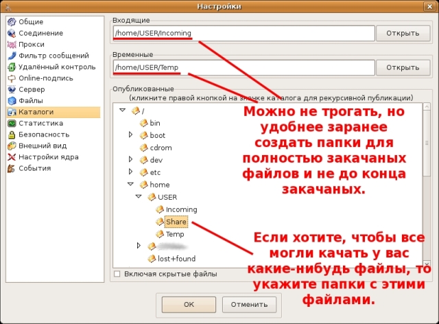 8. В пункте «Каталоги» выбираем папки для Входящих и Временных файлов. Лучше всего разделить эти файлы, так в дальнейшем будет удобнее работать. Если вы желаете предоставить свои файлы для других пользователей, но в разделе «Опубликованные» выберите нужные папки.