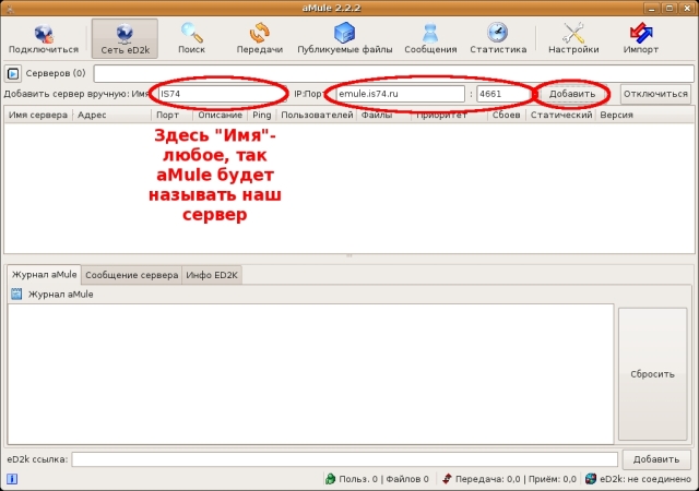 11. Открываем программу, заходим на вкладку «Сеть eD2k». В поля «Имя», «IP:Порт» вводим «IS74», «emule.is74.ru» и «4661» соответственно. В поле «Имя» также можно ввести любое название, именно так в дальнейшем aMule будет называть ваш сервер.