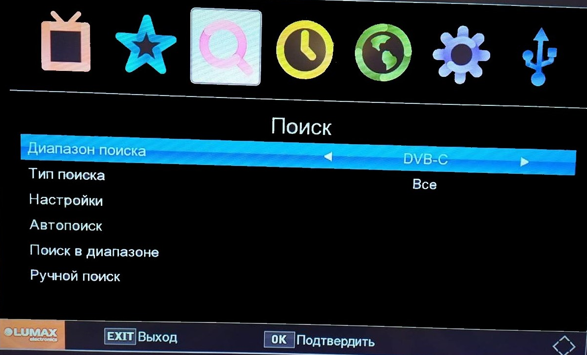 3. Выбрать Диапазон поиска-> DVB-C, нажать CH-.