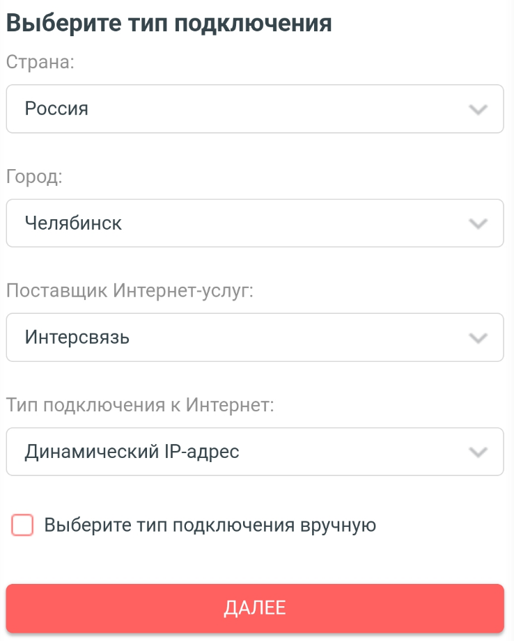 6. Выберите страну, город, провайдера и тип подключения точно так же, как на картинке:
