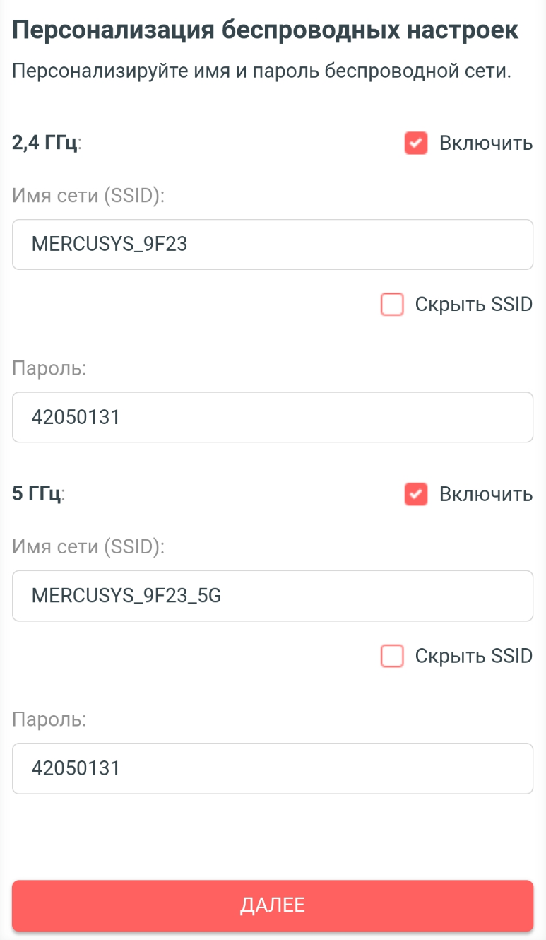 8. Задайте новые имя сети и пароль, либо оставьте системные. Когда определитесь, нажмите "Далее" и после проверки соединения подключите ваше устройство к Wi-Fi снова.