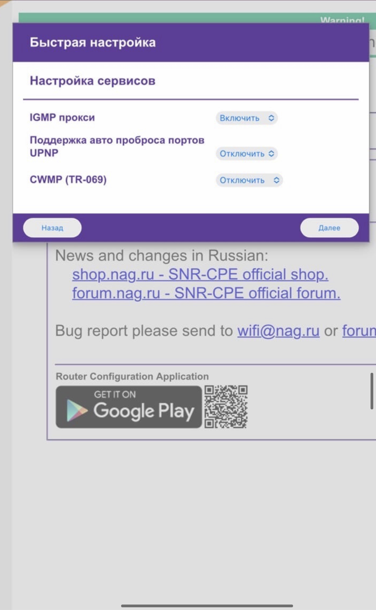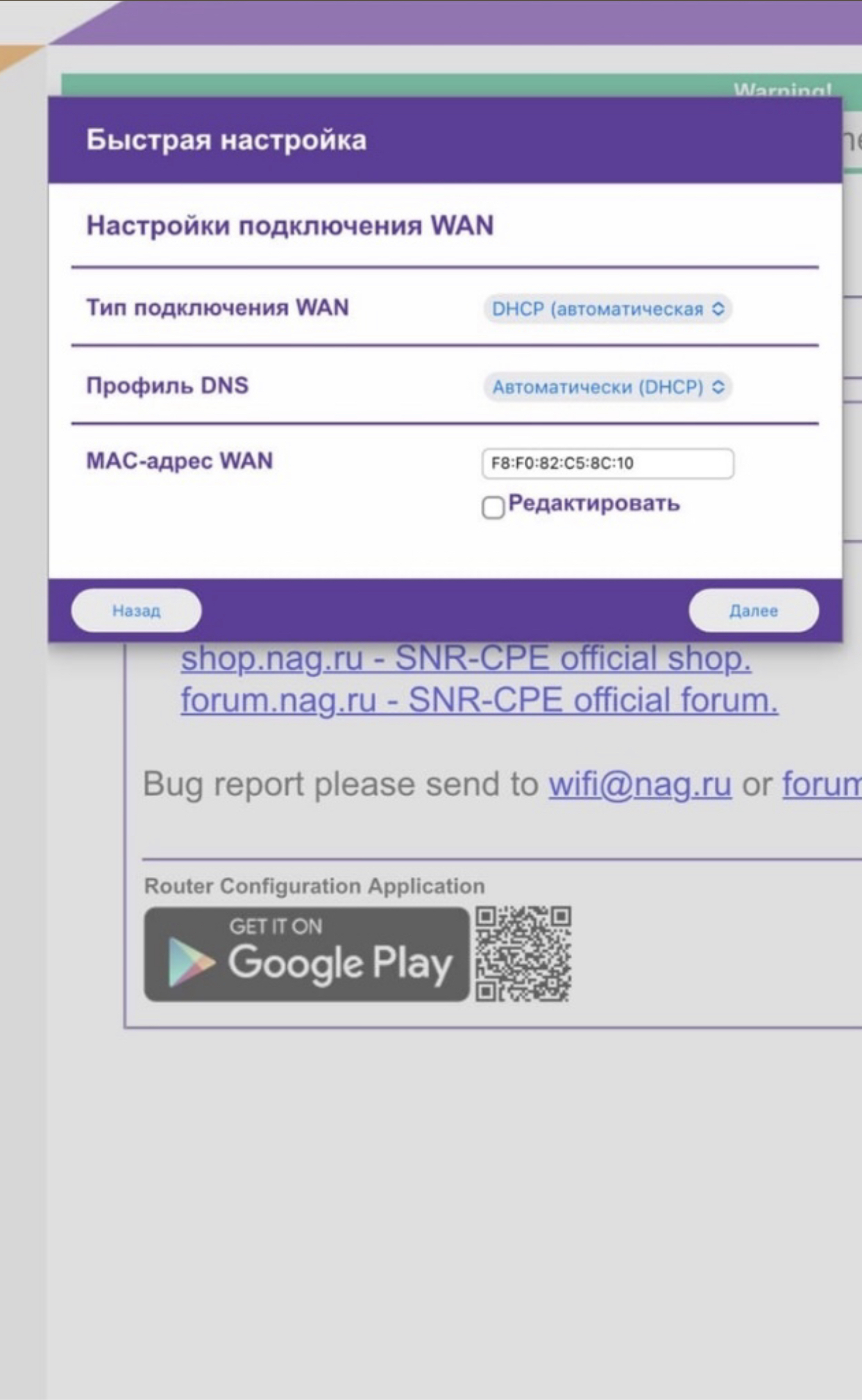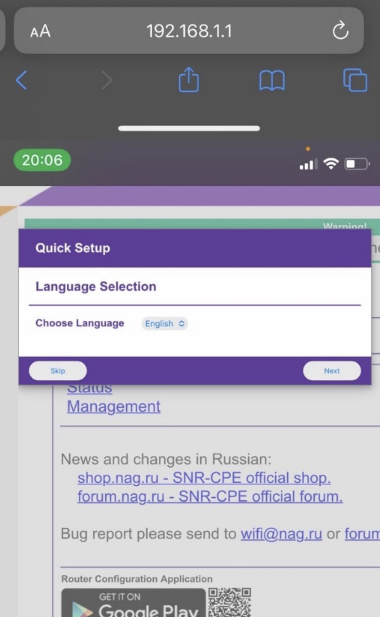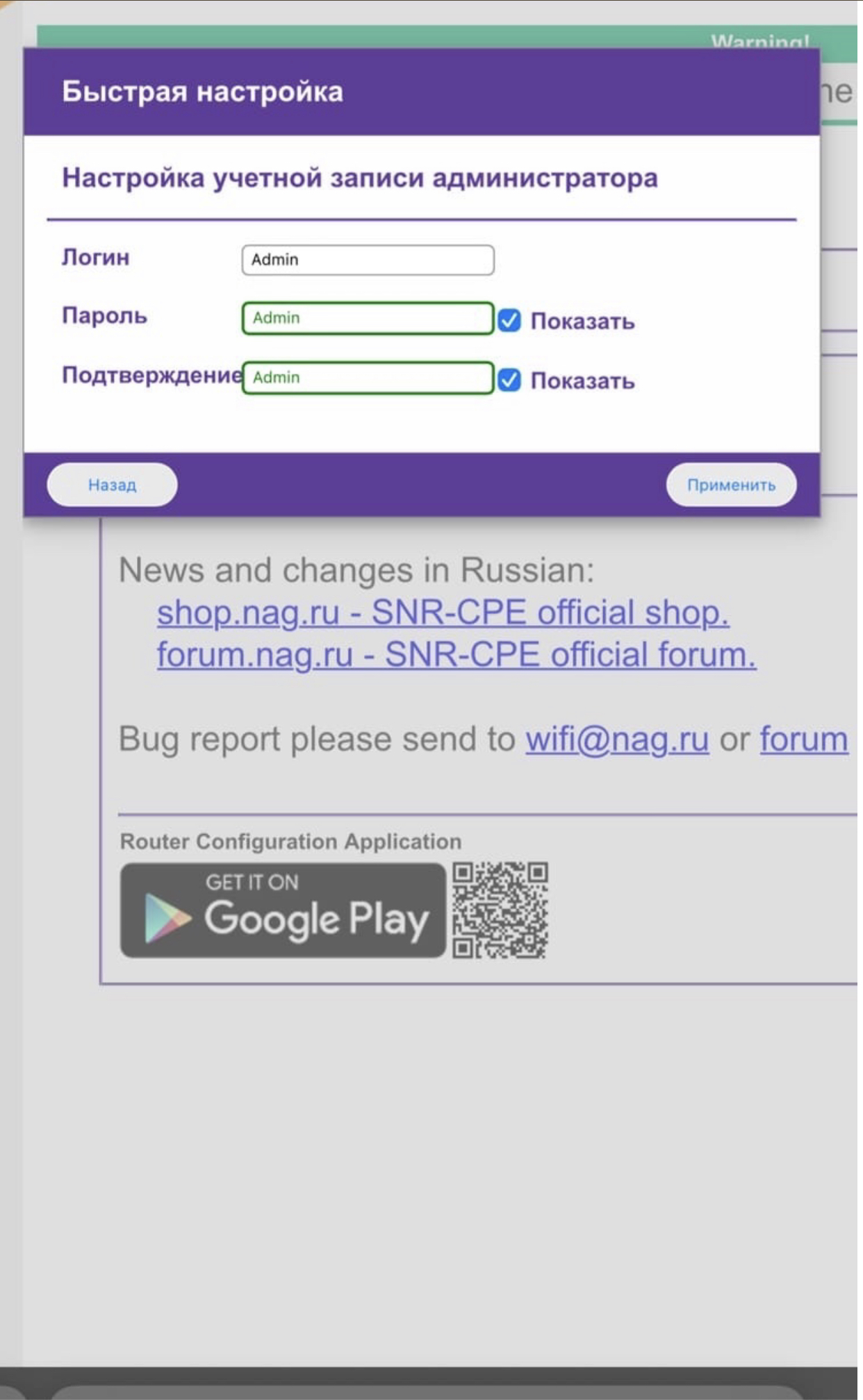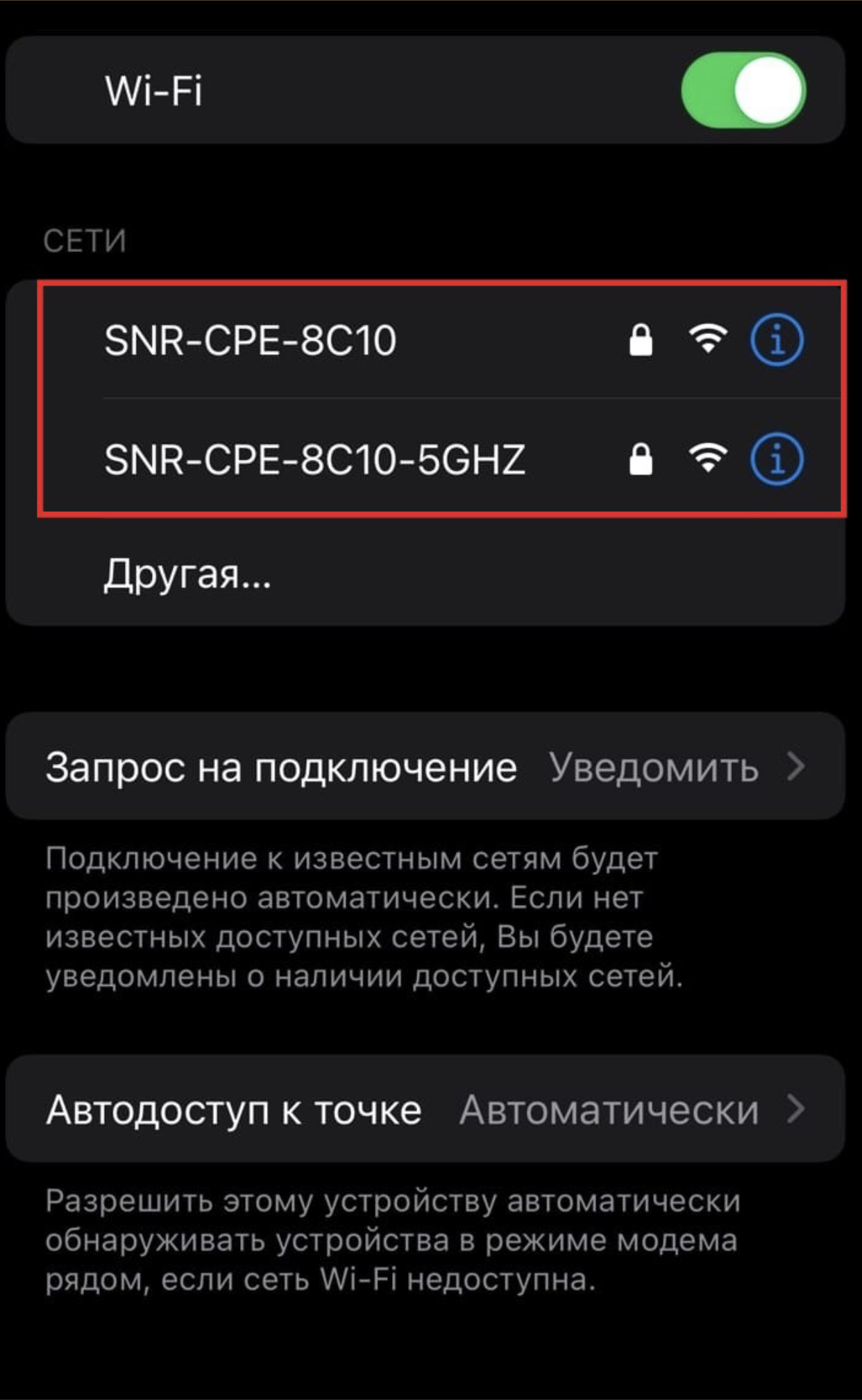 После того, как роутер загрузится, в списке Wi-Fi сетей на Вашем устройстве появятся 2 новые сети с названиями "SNR-CPE-****" и "SNR-CPE-****-5GHZ". Можете подключиться к любой из них.