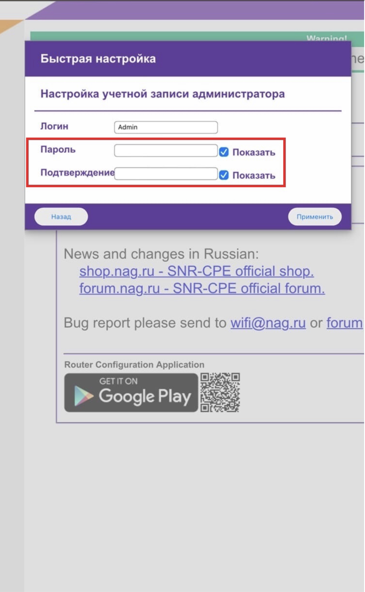 8. Далее Вам нужно придумать и указать пароль для доступа к настройкам роутера. Эти данные мы рекомендуем оставить заводскими, а именно: