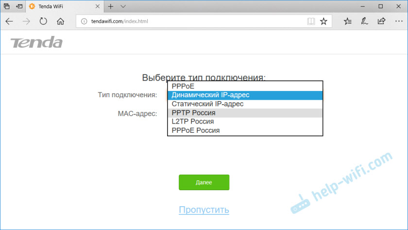 4. Если сетевой кабель подключен верно (в порт WAN), роутер предложит Вам выбрать тип подключения к интернету. Выберите Динамический IP. Больше на этом этапе настраивать ничего не нужно.